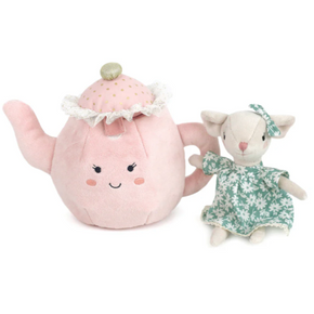 Get ready to pour a cup of fun with our Tea Time Activity Plush Set! This delightful set features a soft pink teapot with the sweetest embroidered smile, rosy blushing cheeks, and a curved spout, sure to charm at every tea party! It comes with an adorable mini plush mouse, dressed in a teal floral-printed dress with a sweet bow behind its ear, making it perfect for pretend play. This little mouse is ready to serve up giggles and imagination! Inspire imaginative play and endless hours of fun with this delightful duo. Lovingly designed with care and attention to detail, these toys are a perfect addition to any nursery or playroom, offering both entertainment and sensory stimulation for your little one. This enchanting set is perfect for sparking imagination and hosting the most whimsical tea parties.