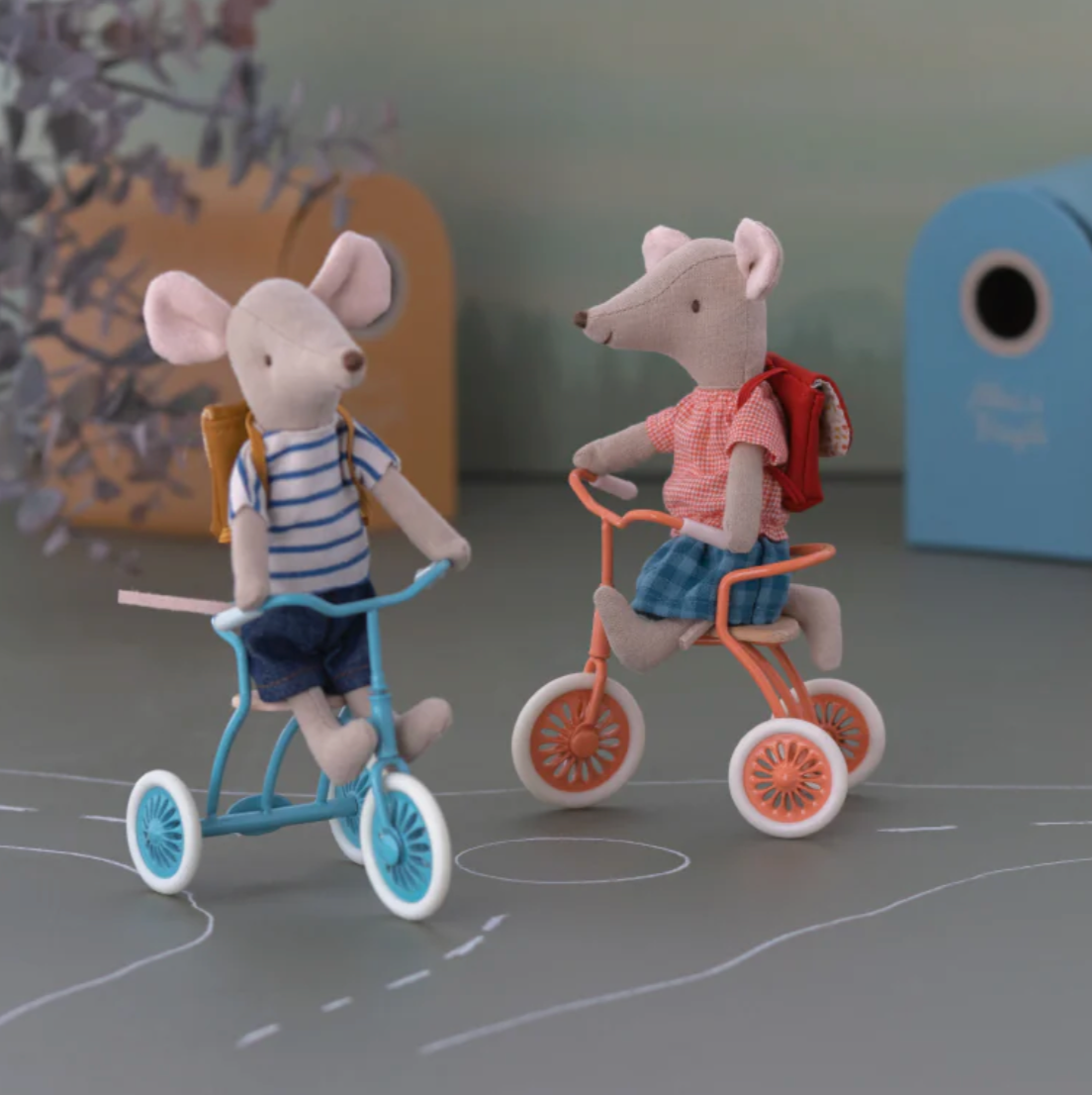 A big sister mouse is dressed for a day in kindergarten or school as she is bringing her backpack. She has magnets in her hands so she can hold the tricycle handles tight for the fast trip